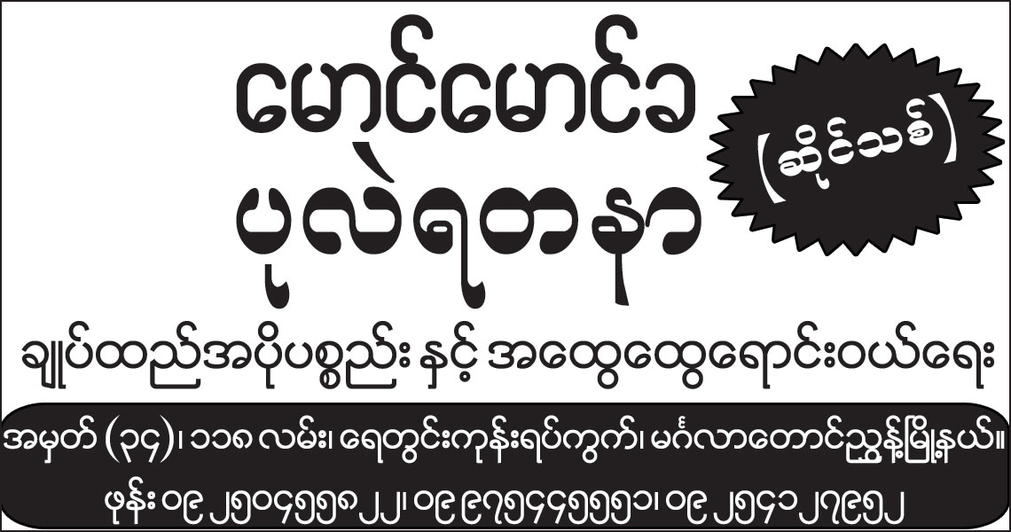 - 34, 118th St., Yae Twin Gone Ward,(အမွတ္ ၃၄၊ (၁၁၈)လမ္း၊ ေရတြင္းကုန္းရပ္ကြက္၊)