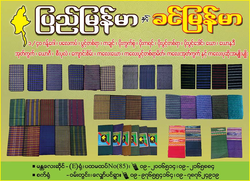 • ဂန္႔ေဂါ၊ ပေလကပ္၊ ပြင့္တစ္ရာ၊ ကခ်င္၊ ပိုးကြက္စံု ပိုးကရင္၊ ပိုးပြင့္တစ္ရာ၊ ပိုးပြင့္ေဒါင္၊ ေယာ၊ ေယာနဒီ၊ အုတ္ကြက္၊ ႀကိဳးေဒါင္းစင္း၊ ေယာဂီစီးပုလဲ၊ ေက်ာင္းစိမ္းႏွင့္ကေလးပုဆိုးအမ်ိဳးမ်ိဳး။
