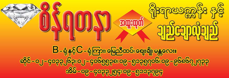 - G Flr, Zaycho, Bet; Si(B)Sheed & (C)Sheed,(ေျမညီထပ္၊ ေဈးခိ်ဳ၊ (ဘီ)႐ံုႏွင့္(စီ)႐ံုၾကား၊)