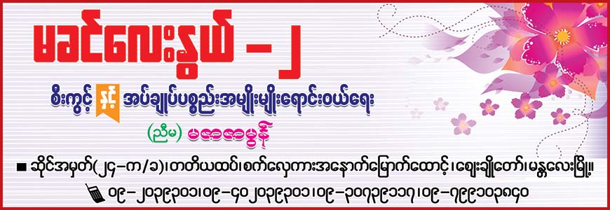 - 24-Ka/Kha, 3rd Flr, Zaycho, Sat Hlay Khar Ah Nauk Myauk Htaut,(အမွတ္ ၂၄-က/ခ၊ တတိယထပ္၊ ေဈးခိ်ဳ၊ စက္ေလွကားအေနာက္ေျမာက္ေထာင့္၊)