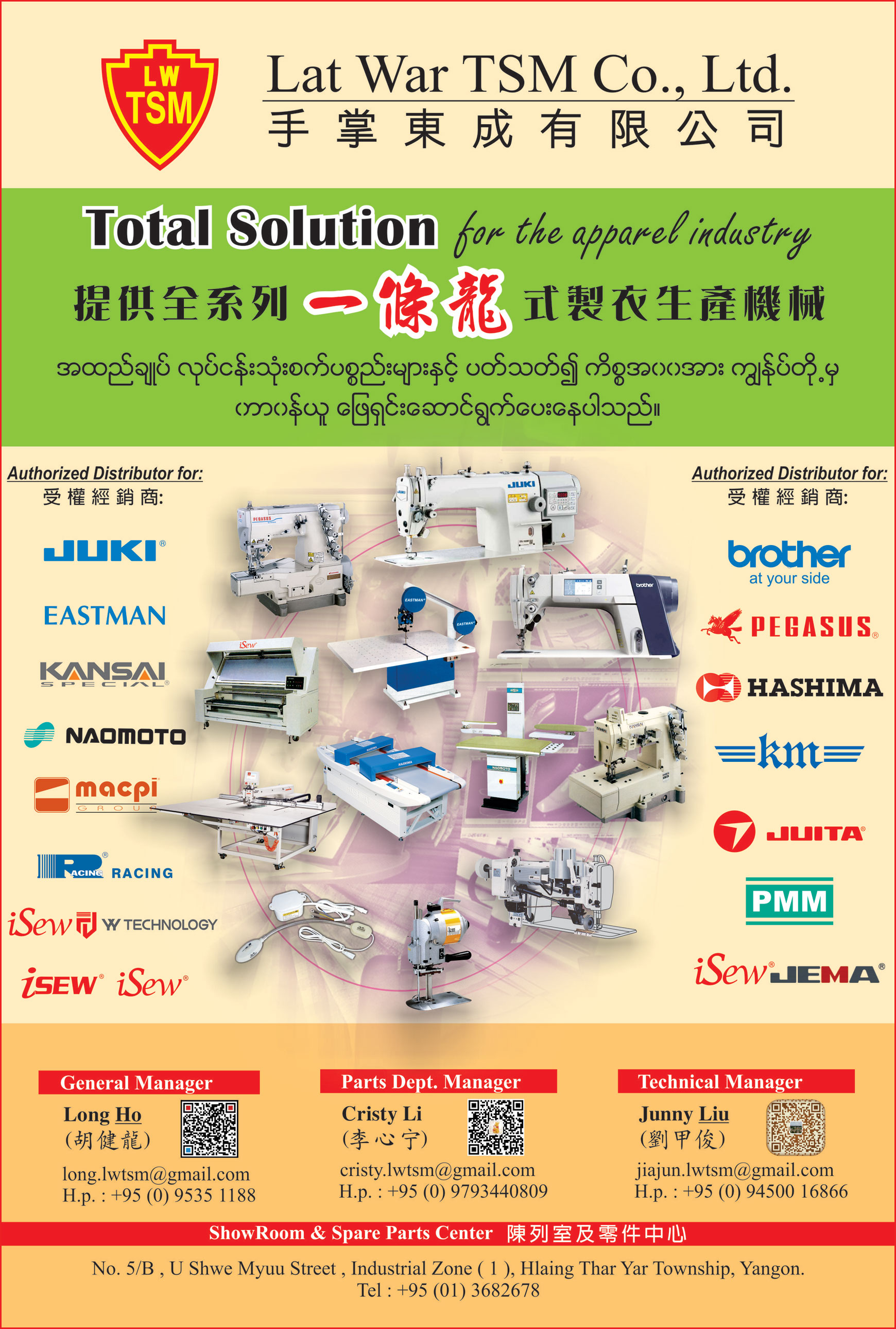 - Multi Brands and Multi Products you Choice/ The Best Supply System and Services The Best All & One Solution For Myanmar Garment.