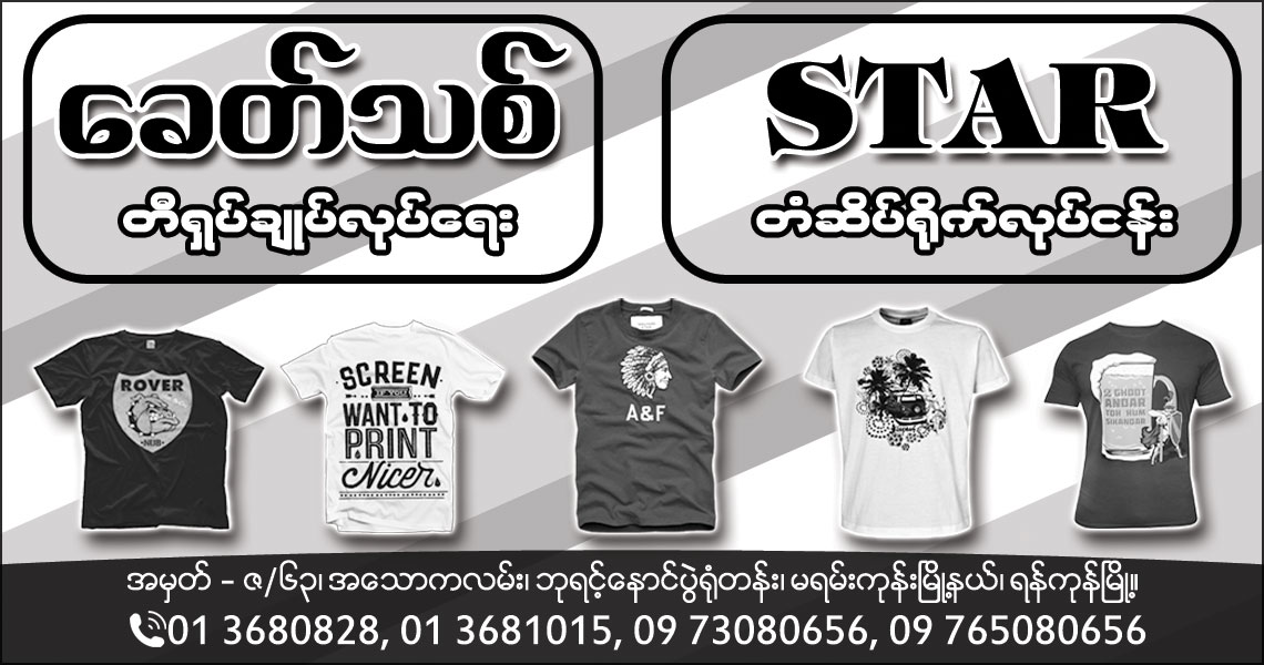 - Za-63, Ar Thaw Ka St., Bayint Naung Warehouses,(အမွတ္ ဇ-၆၃၊ အေသာကလမ္း၊ ဘုရင္႕ေနာင္ပဲြ႐ံုတန္း၊)
