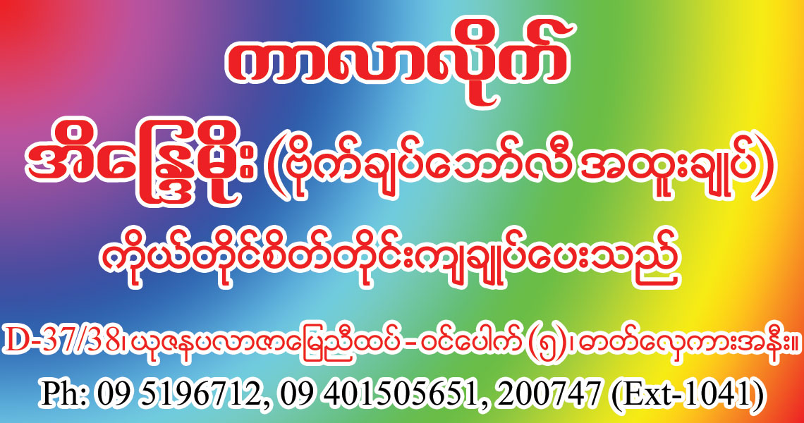 - Rm D-37/38, G Flr, Yuzana Plaza, Entrance (5),(အခန္း ဒီ-၃၇/၃၈၊ ေျမညီထပ္၊ ယုဇနပလာဇာ၊ ဝင္ေပါက္(၅)၊)