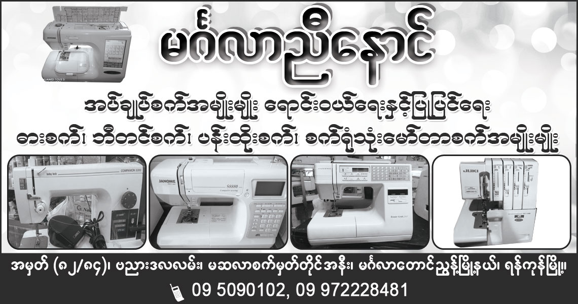 - ဓားစက္၊ ဘီတင္စက္၊ ပန္းထိုးစက္၊ စက္႐ံုသံုးေမာ္တာစက္အမ်ိဳးမ်ိဳး