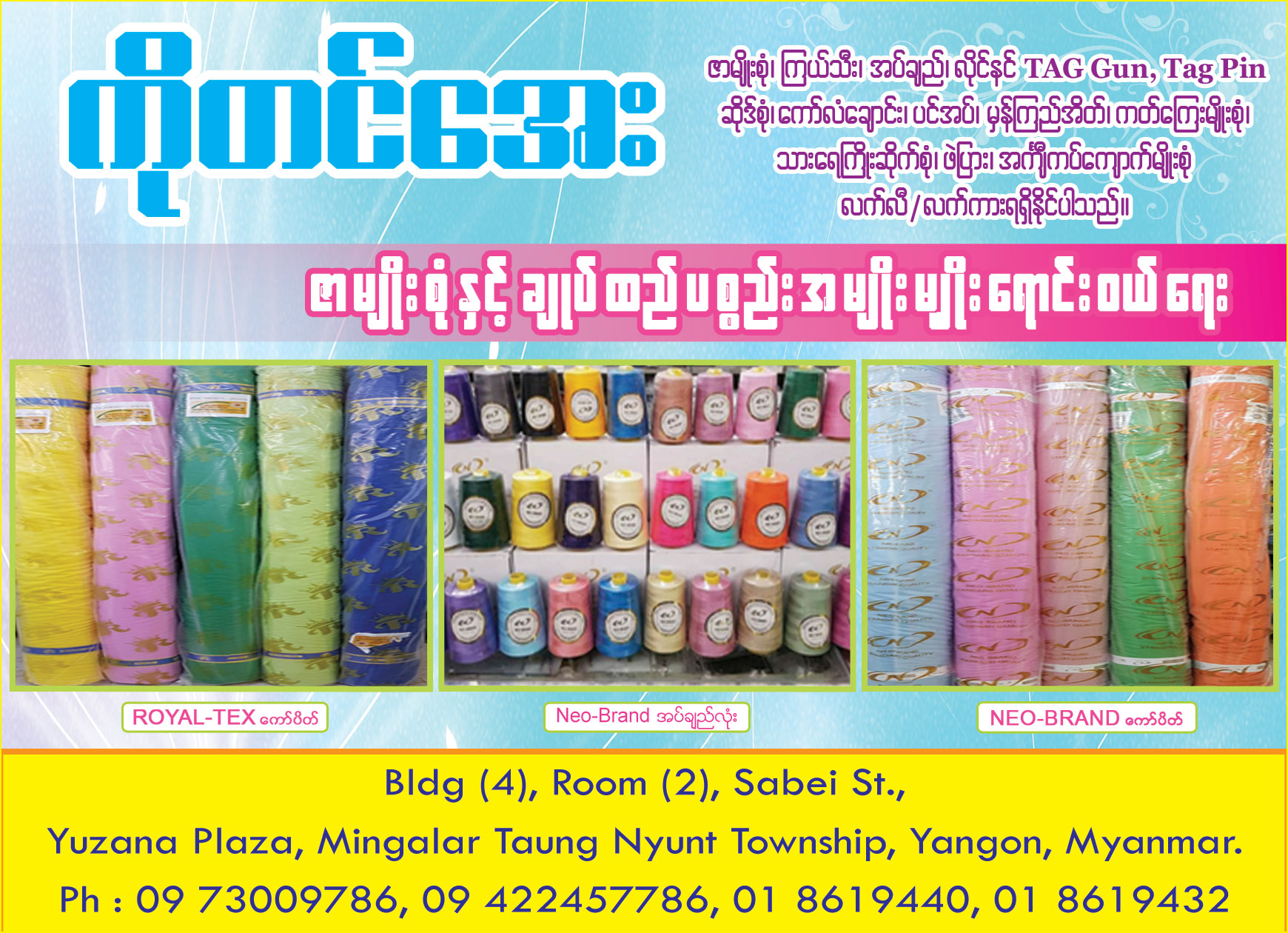 - ဇာမ်ိဳးစံု၊ၾကယ္သီး၊အပ္ခ်ည္၊လိုင္နင္၊ TAG Gun၊ Tag Pin ဆိုဒ္စံု၊ေကာ္လ့ေခ်ာင္း၊ပင္အပ္၊မွန္ၾကည္အိတ္၊ကတ္ေၾကးမ်ိဳးစံု၊သားေရၾကိဳးဆိုဒ္၊ဖဲျပား၊အက်ႍကပ္ေက်ာက္မ်ိဳးစံုလက္လီလက္ကားရရွိနိုင္ပါသည္။