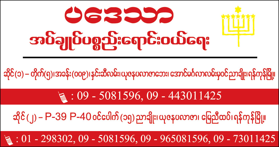 - Rm 009, Bldg 5, Hnin Si St., Beside Yuzana Plaza,(အခန္း ၀၀၉၊ တိုက္ ၅၊ ႏွင္းဆီလမ္း၊ ယုဇနပလာဇာ ေဘး၊)