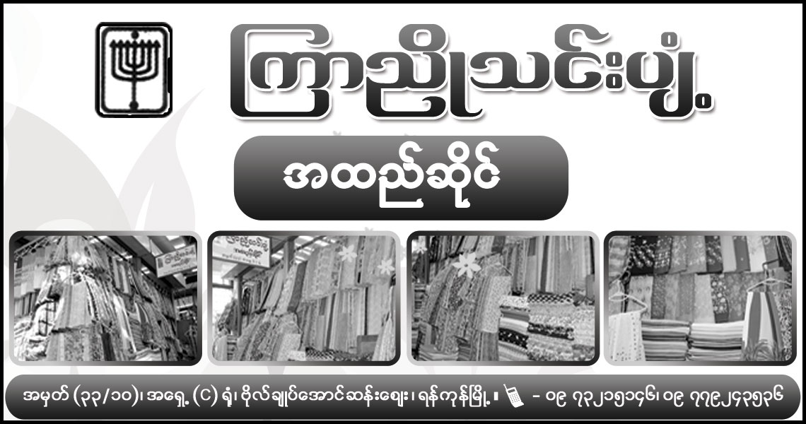 - 33/10, East (C) Shed, Bogyoke Aung San Market,(အမွတ္ ၃၃/၁၀၊ အေရွ႕(စီ)-႐ံု၊ ဗိုလ္ခ်ဳပ္ေအာင္ဆန္းေဈး၊)