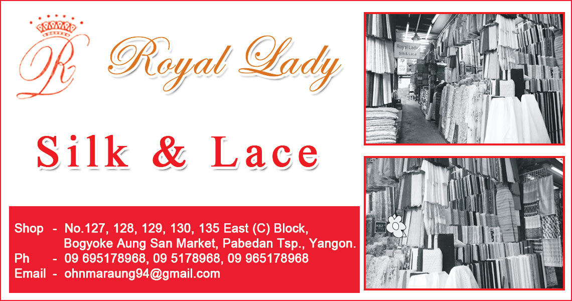 - Blk East C, 127/128/129/130/135, Bogyoke Aung San Market,(အကြက္ အေ႐ွ႕(စီ)၊ အမွတ္ ၁၂၇/၁၂၈/၁၂၉/၁၃၀/၁၃၅၊ ဗိုလ္ခ်ဳပ္ေအာင္ဆန္းေဈး၊)