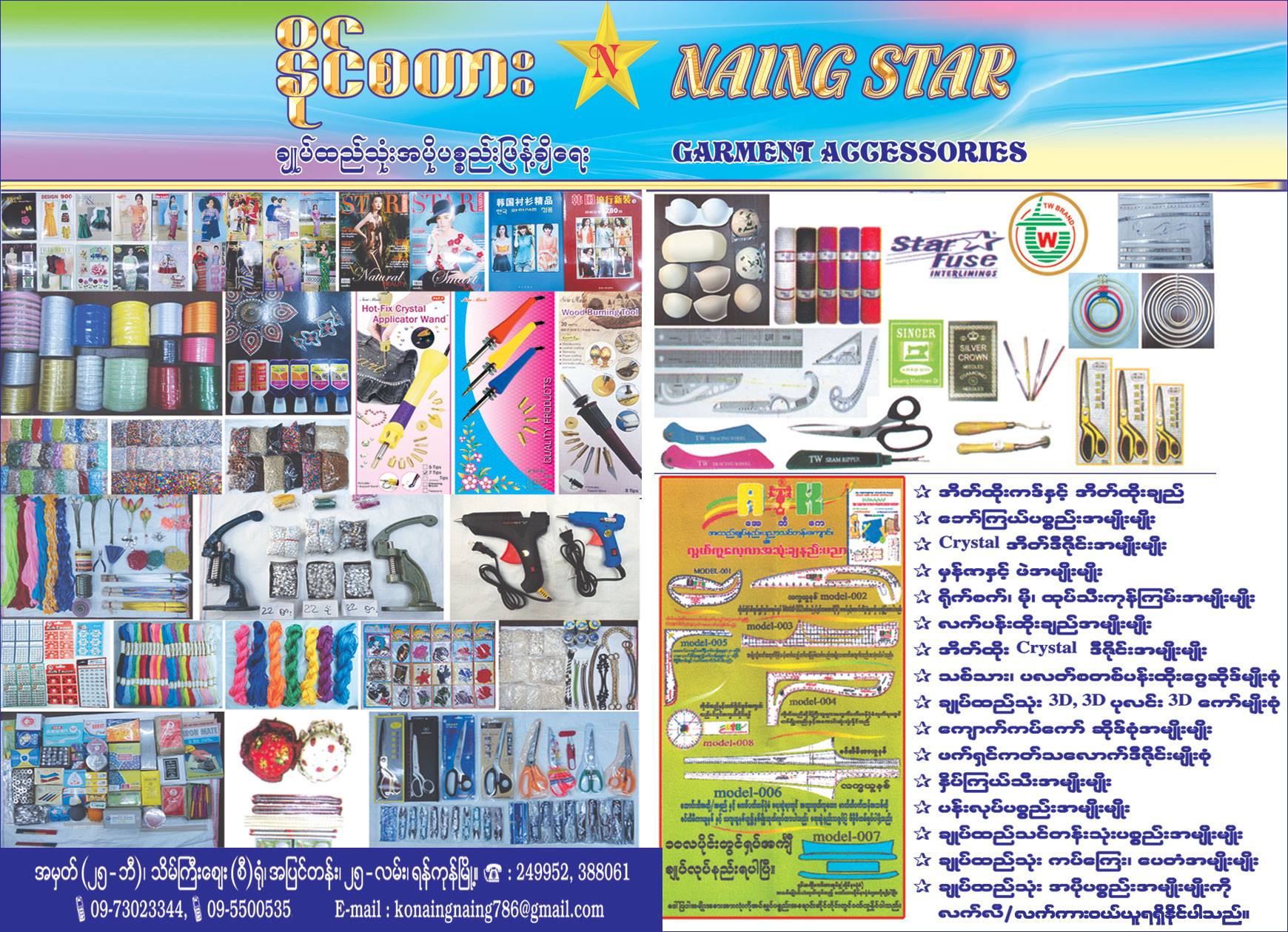 • ဖက္ရွင္ကတ္သေလာက္ ဒီဇုိင္းမ်ဳိးစံု၊ ႏွိပ္ၾကယ္သီး အမ်ဳိးမ်ဳိး၊ ပန္းလုပ္ပစၥည္းအမ်ဳိးမ်ဳိး၊ ခ်ည္ထည္သင္တန္းသံုးပစၥည္းအမ်ဳိးမ်ဳိး၊ ခ်ည္ထည္သံုး အပုိပစၥည္းအမ်ဳိးမ်ဳိးကုိ လက္လီလက္ကား ဝယ္ယူရရွိနုိင္ပါသည္။