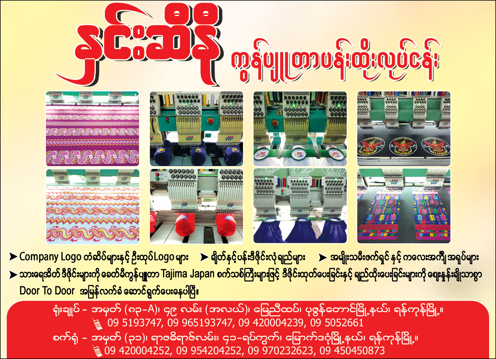 • သားေရအိတ္ ဒီဇုိင္းမ်ားကုိ ေခတ္မီကြန္ပ်ဴတာ Tajinma Japan စက္သစ္ႀကီးမ်ားျဖင့္ ဒီဇုိင္းထုတ္ေပးျခင္းႏွင့္ ခ်ည္ထုိးေပးျခင္းမ်ားကုိ ေစ်းႏႈန္းခ်ဳိသာစြာ Door to Door အျမန္လက္ခံေဆာင္ရြက္ေပးေနပါၿပီ။