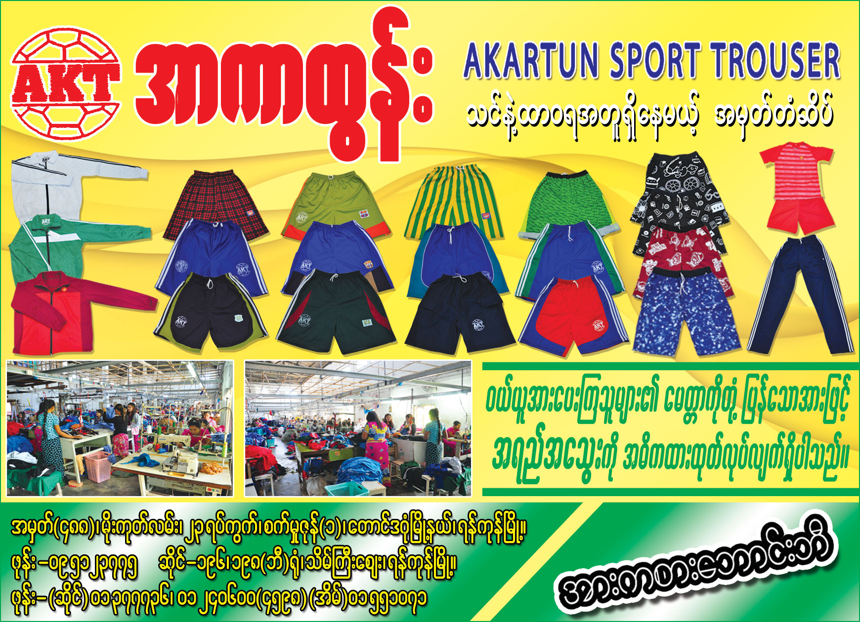 အာကာထွန်း အမှတ်တံဆိပ်အား 1988 ခုနှစ်မှ စတင်၍ ကလေးဝတ်အထည်အမျိုးမျိုး ၊ ကျောင်းဝတ်စုံအမျိုးမျိုးအား အိမ်တွင်း စက်မှုလက်မှုလုပ်ငန်းအနေဖြင့် ထုတ်လုပ်ဖြန့်ချိခဲ့ပြီး 1999 နောက်ပိုင်းတွင် စက်မှုလုပ်ငန်းအသွင်သို့ကူးပြောင်းကာ ထုတ်ကုန်များအား ဈေးကွက်လိုအပ်ချက်အရ အားကစားဘောင်းဘီနှင့်ဘောင်းဘီအမျိုးမျိုး ကိုတိုးချဲ့ထုတ်လုပ်ဖြန့်ချိခဲ့ ပါသည်။ လက်ရှိတွင် အားကစား ဘောင်းဘီ အမျိုးမျိုးကို အဓိကထား ထုတ်လုပ်ပြီး အခြားအနေဖြင့် ရှပ်၊ မဝတ၊် ဘလောက်(စ်)များ ၊ အားကစားဝတ်စုံ ( Truck Suit ) များ ၊ ကုမ္ပဏီကြော်ငြာအထည်များနှင့် Export အထည်များ အတွက် CNP စနစ်ဖြင့် အော်ဒါများကို စိတ်တိုင်းကျသည်အထိ တာဝန်ယူလက်ခံဆောင်ရွက်ပေးလျှက် ရှိပါသည်။