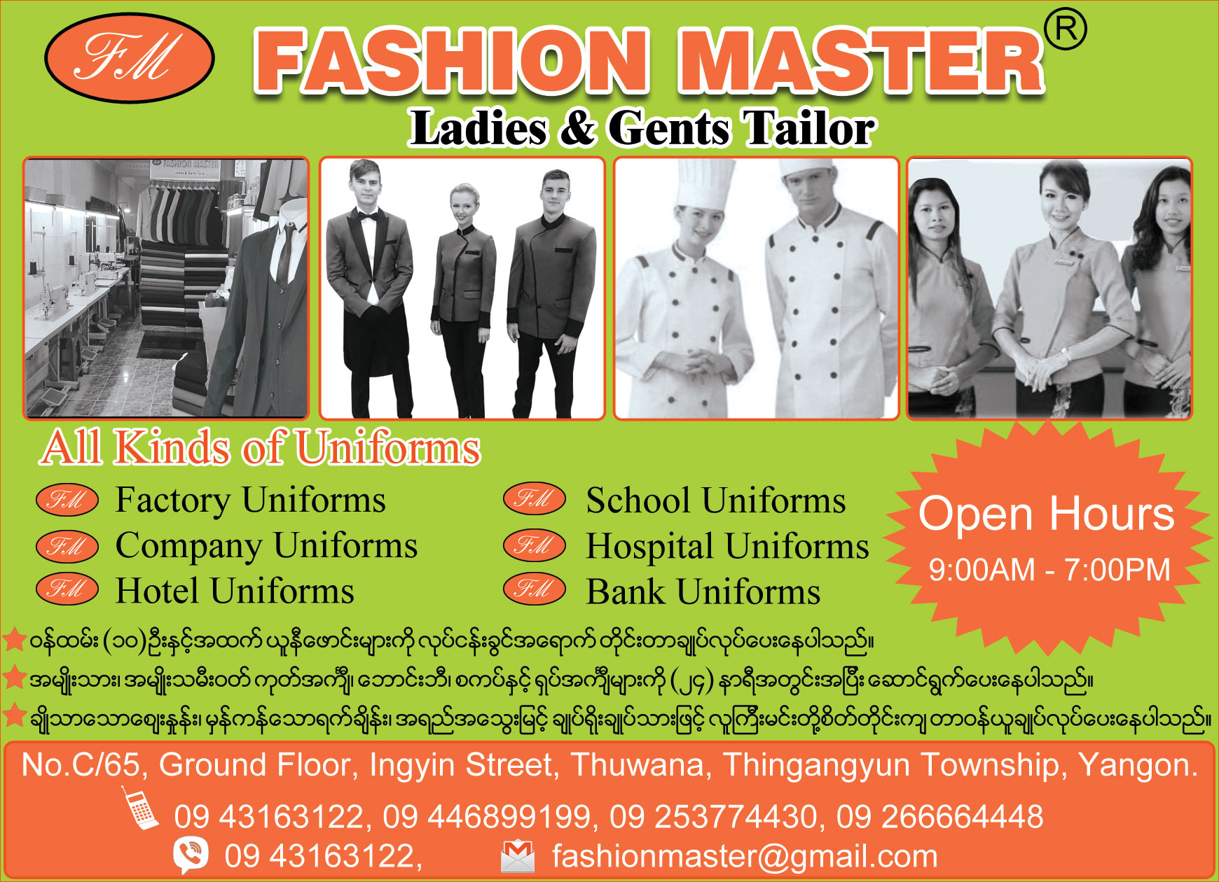 - 65/C, G Flr, Ingyin St., Thuwunna,(အမွတ္ ၆၅/စီ၊ ေျမညီထပ္၊ အင္ၾကင္းလမ္း၊ သုဝဏၰ၊)