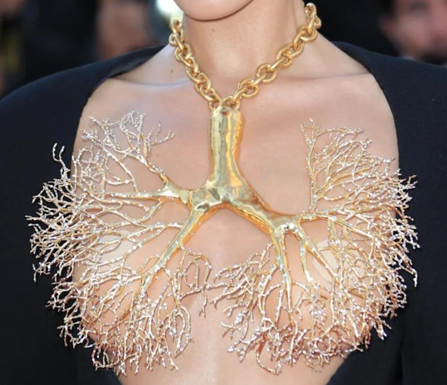 ရင်နှစ်မွှာ အဖောင်းအကြွပေါ်မှာတော့ ရွှေအဆုပ်လည်ဆွဲ နေရာယူထားပါတယ်။ လေပြွန်မကြီးကနေ လေပြွန်ငယ်ကလေးတွေ လူ့အဆုပ်ထဲမှာ သစ်ခက်တွေလို ခက်ဖြာသွားတဲ့အတိုင်း ပုံဖော်ပေးထားတာ စိတ်ဝင်စားစရာ ပါပဲ။ လေပြွန်ငယ်ကလေးတွေရဲ့ အဆုံးသတ်မှာ စိန်တုအပွင့်တွေ တပ်ဆင်ပြီး အဆုံးသတ်ပေးထားပါတယ်။