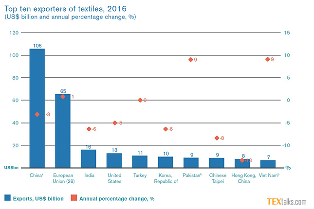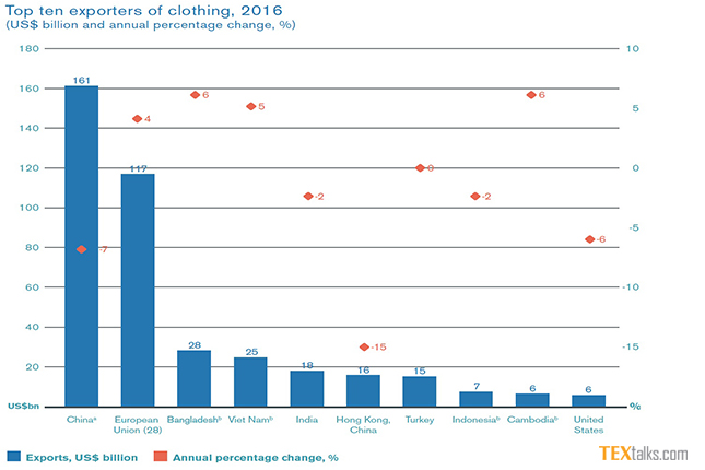 ကမ္ဘာ့ အထည်အလိပ်နဲ့ ချုပ်ထည်(အဝတ်အစား) ပြည်ပတင်ပို့မှု ကန်ဒေါ်လာ ၃၈၄ ဘီလျံ ရှိပါတယ်။ ၂၀၁၆ ခုနှစ်နဲ့ နှိုင်းယှဉ်ရင် အထည်အလိပ်တင်ပို့မှုမှာ ကန်ဒေါ်လာ ၂၂ ဘီလျံ လျော့သွားတယ်။ ချုပ်ထည်အဝတ်အစားမှာ ကန်ဒေါ်လာ ၃ ဘီလျံ လျော့ကျသွားတယ်။