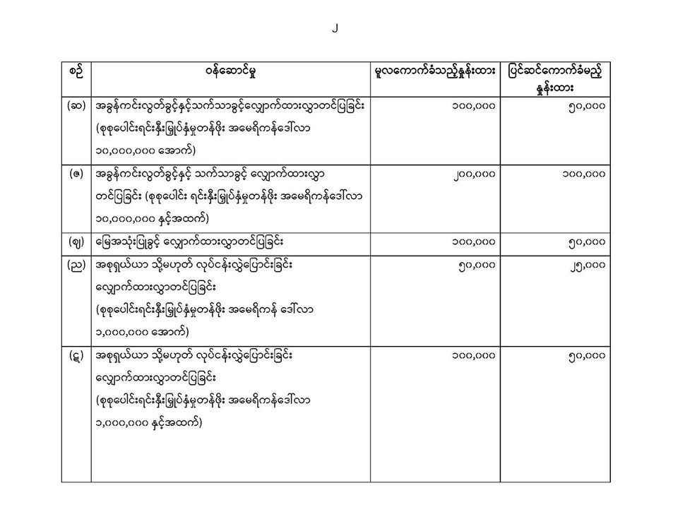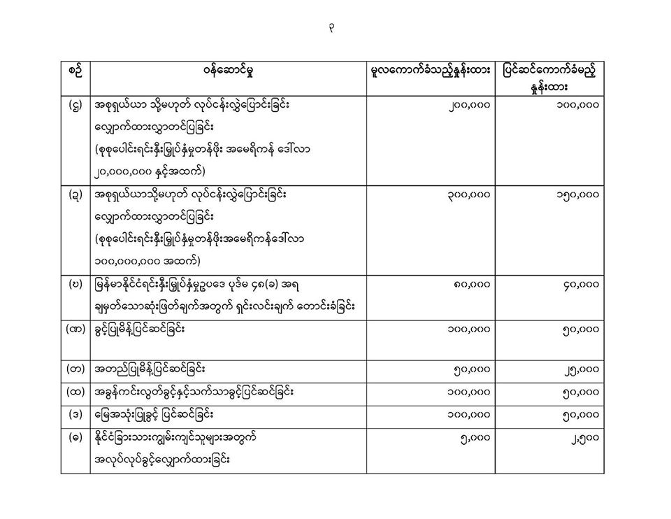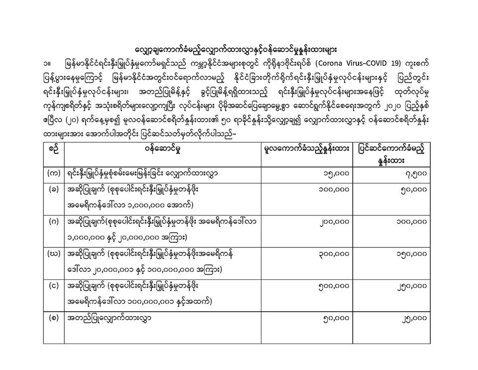 ၂၀၂၀ ျပည့္ႏွစ္ဧၿပီလ ၂၀ ရက္ေန႔မွစ၍မူလဝန္ေဆာင္စရိတ္ႏႈန္းထားမ်ား၏ ၅၀ ရာခိုင္ႏႈန္းသို႔ေလွ်ာ့ခ်၍
