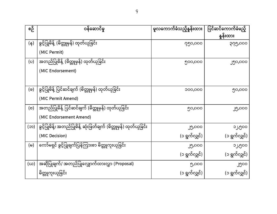 ေလွ်ာက္ထားလႊာႏွင့္ဝန္ေဆာင္စရိတ္ႏႈန္းထားမ်ားအား ေအာက္ပါအတိုင္းျပင္ဆင္သတ္မွတ္လိုက္ပါသည္။