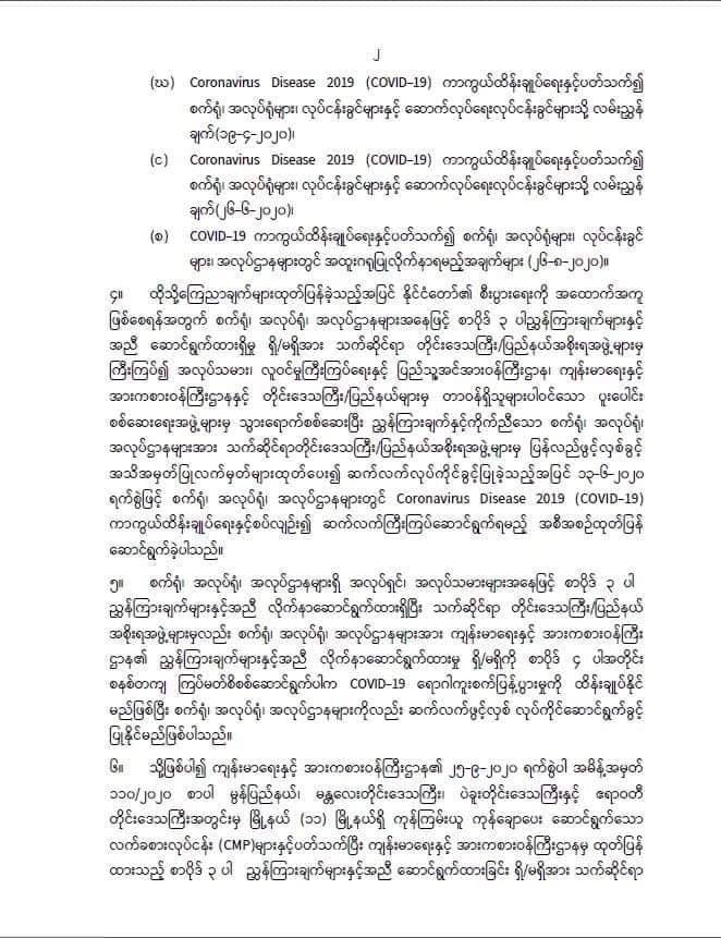 ၁။ ကျန်းမာရေးနှင့် အားကစားဝန်ကြီးဌာန၏ ၂၅-၉-၂ဝ၂ဝ ရက်စွဲပါ အမိန့်အမှတ် ၁၁၀/၂၀၂၀ စာတွင် မွန်ပြည်နယ်၊ မန္တလေးတိုင်းဒေသကြီး၊ ပဲခူးတိုင်းဒေသကြီးနှင့် ဧရာဝတီတိုင်းဒေသကြီး အတွင်းမှ မြို့နယ် (၁၁) မြို့နယ်ရှိ ကုန်ကြမ်းယူ ကုန်ချောပေးဆောင်ရွက်သော လက်ခစားလုပ်ငန်း (CMP) စက်ရုံ၊ အလုပ်ရုံများတွင် တာဝန်ထမ်းဆောင်မည့်သူများ၊ လုပ်ငန်းဆောင်ရွက်ခွင့်နှင့်စပ်လျဉ်း ၍ မည်သို့ဆောင်ရွက်သင့်သည်ကို သက်ဆိုင်ရာ တိုင်းဒေသကြီး/ပြည်နယ်အစိုးရအဖွဲ့များအနေဖြင့် အလုပ်သမား၊ လူဝင်မှုကြီးကြပ်ရေးနှင့် ပြည်သူ့အင်အားဝန်ကြီးဌာန၊ ကျန်းမာရေးနှင့်အားကစားဝန်ကြီး ဌာနတို့နှင့် ညှိနှိုင်း၍ နောက်ဆက်တွဲအမိန့်စာ ထုတ်ပြန်ပေးရန်ဖော်ပြပါရှိပါသည်။