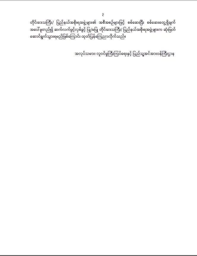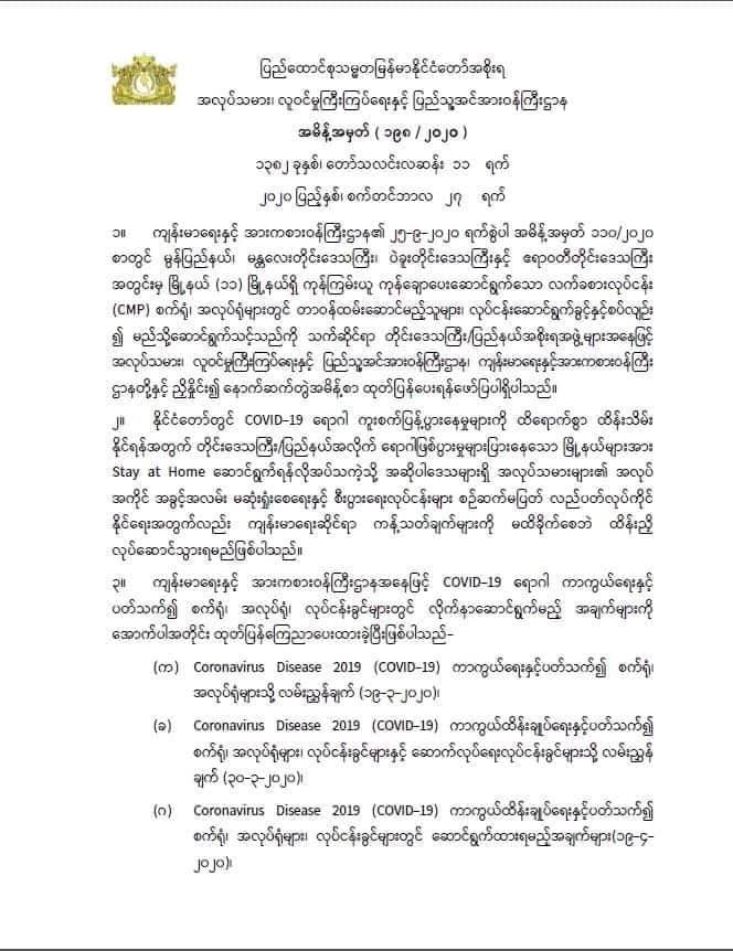 ၂။ နိုင်ငံတော်တွင် COVID-19 ရောဂါ ကူးစက်ပြန့်ပွားမှုများကို ထိရောက်စွာ ထိန်းသိမ်း နိုင်ရန်အတွက် တိုင်းဒေသကြီး/ပြည်နယ်အလိုက် ရောဂါဖြစ်ပွားမှုများပြားနေသော မြို့နယ်များအား Stay at Home ဆောင်ရွက်ရန်လိုအပ်သကဲ့သို့ အဆိုပါဒေသများရှိ အလုပ်သမားများ၏ အလုပ် အကိုင် အခွင့်အလမ်း မဆုံးရှုံးစေရေးနှင့် စီးပွားရေးလုပ်ငန်းများ စဉ်ဆက်မပြတ် လည်ပတ်လုပ်ကိုင် နိုင်ရေးအတွက်လည်း ကျန်းမာရေးဆိုင်ရာ ကန့်သတ်ချက်များကို မထိခိုက်စေဘဲ ထိန်းညှိ လုပ်ဆောင်သွားရမည်ဖြစ်ပါသည်။