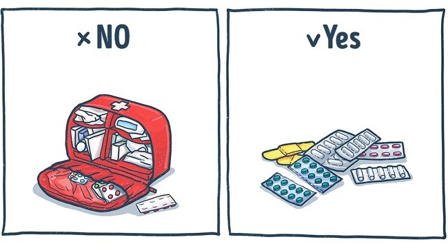 ခရီးသွားတဲ့အခါမှာ ဆေးဝါးကိုတွေကို အများကြီးသယ်မသွားပါနဲ့။ မလိုအပ်ပဲ လက်ဆွဲအိတ်မှာ နေရာတွေ အများကြီးယူပါတယ်။ အရေးကြီးတဲ့ ဆေးတွေကို သေချာရွေးပြီးမှာ ယူပါ။