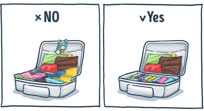 အက်ႌေတြ တြန္႔ေခါက္မေနဖို႔နဲ႔ လက္ဆြဲအိတ္ေနရာ က်ယ္က်ယ္ ထြက္လာေစဖို႔ အဝတ္အစားေတြကို ေခါက္ျပီးထည္႔မဲ႔ အစား လွိမ္ျပီး ထည္႔ပါ။