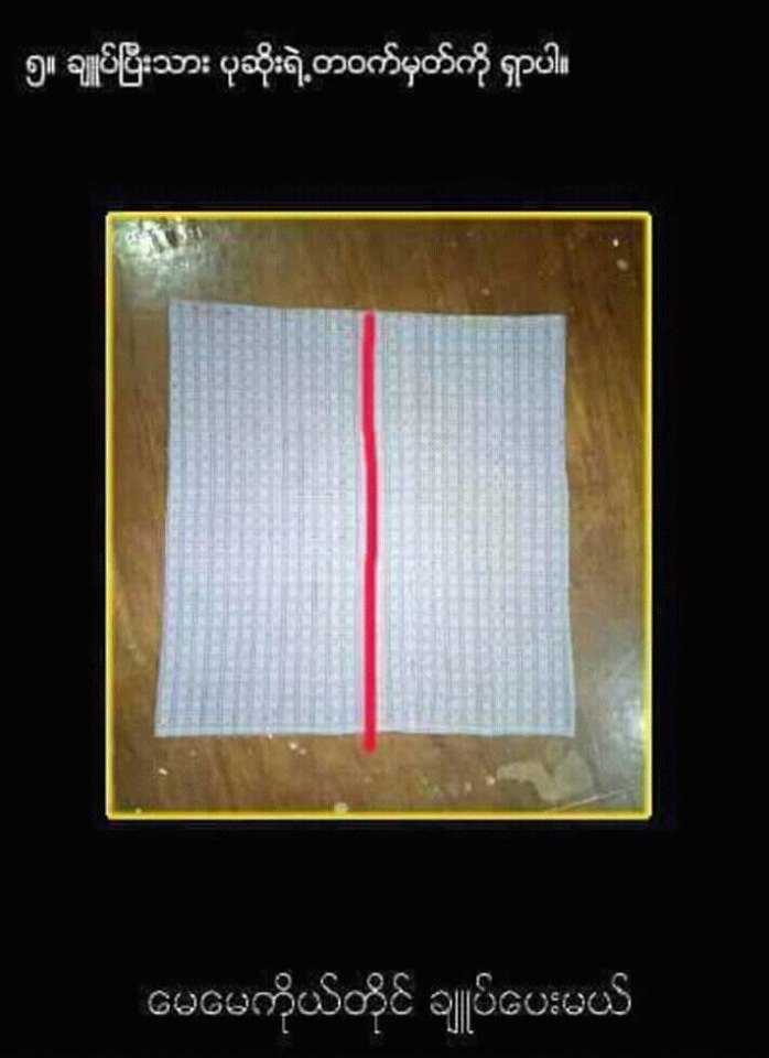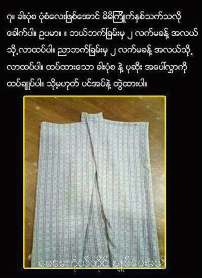 ၇။ ခါးပုံစ ပုံစံေလးျဖစ္ေအာင္ မိမိႀကိဳက္ႏွစ္သက္သလို ေခါက္ပါ။ဥပမာ။ ဘယ္ဘက္ျခမ္းမွ၂လက္မခန္႔အလယ္သို႔ လာထပ္ပါ။