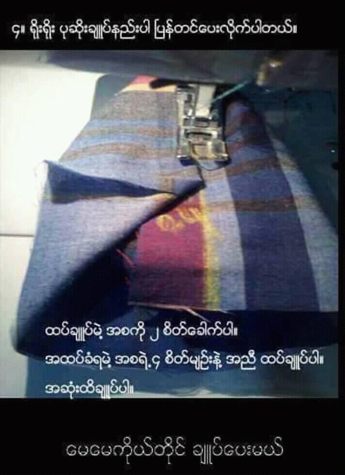 အားလုံးအတြက္ အဆင္ေျပမယ္လို႔ ေမွ်ာ္လင့္ပါတယ္ရွင့္။ Textileကေန စက္ခ်ဳပ္နည္းေတြကို အဂၤါ၊ၾကာသပေတး၊စေနေန႔ မနက္၉နာရီေတြမွာ အသစ္တင္ေပးပါမယ္ရွင့္။