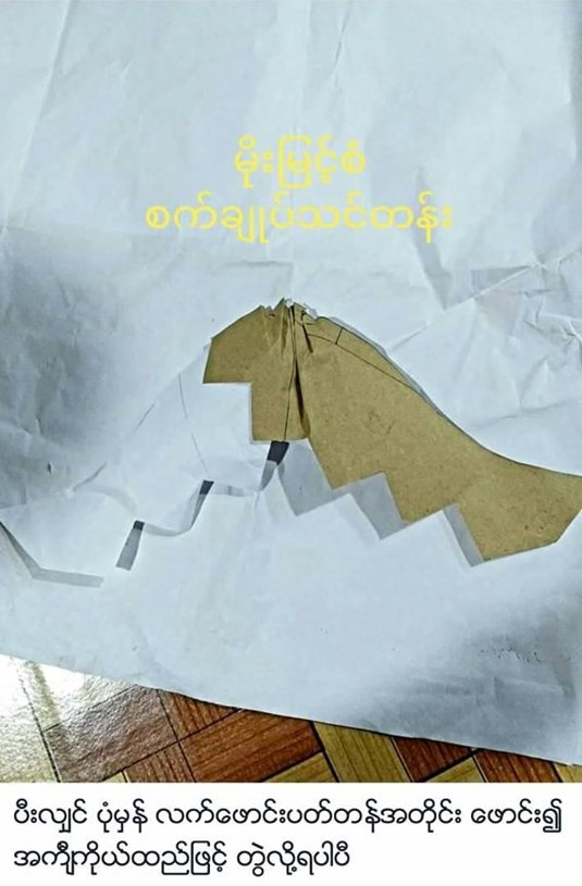 ရလာေသာ ၂ပိုင္းကို ခုနကပ္ေၾကးေတာက္ထားတဲ့ အမွတ္၂ခုကို ထပ္ပါ(စက္ျဖင့္ တစ္ေၾကာင္းဖိနင္းပါ)