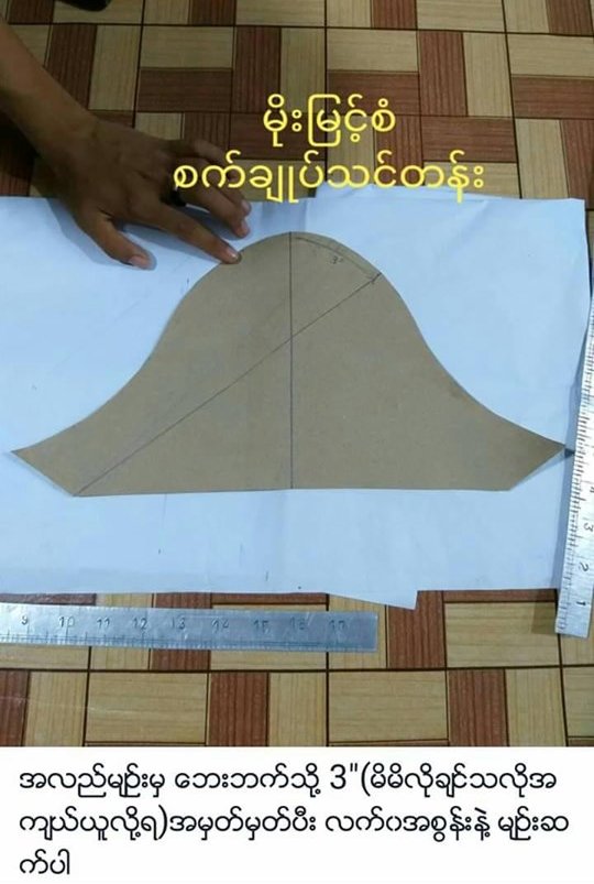 အလယ္မ်ဥ္းမွ ေဘးဘက္သို႔ ၃လက္မ(မိမိလိုခ်င္သလိုအက်ယ္ယူလို႔ရ) အမွတ္မွတ္ၿပီး လက္ဝအစြန္းနဲ႔ မ်ဥ္းဆက္ပါ။