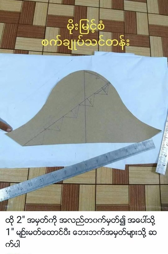 ထို၂လက္မ အမွတ္ကို အလယ္တစ္ဝက္မွတ္၍ အေပၚသို႔ ၁လက္မ မ်ဥ္းမတ္ေထာင္ၿပီး ေဘးဘက္အမွတ္မ်ားသို႔ ဆက္ပါ။