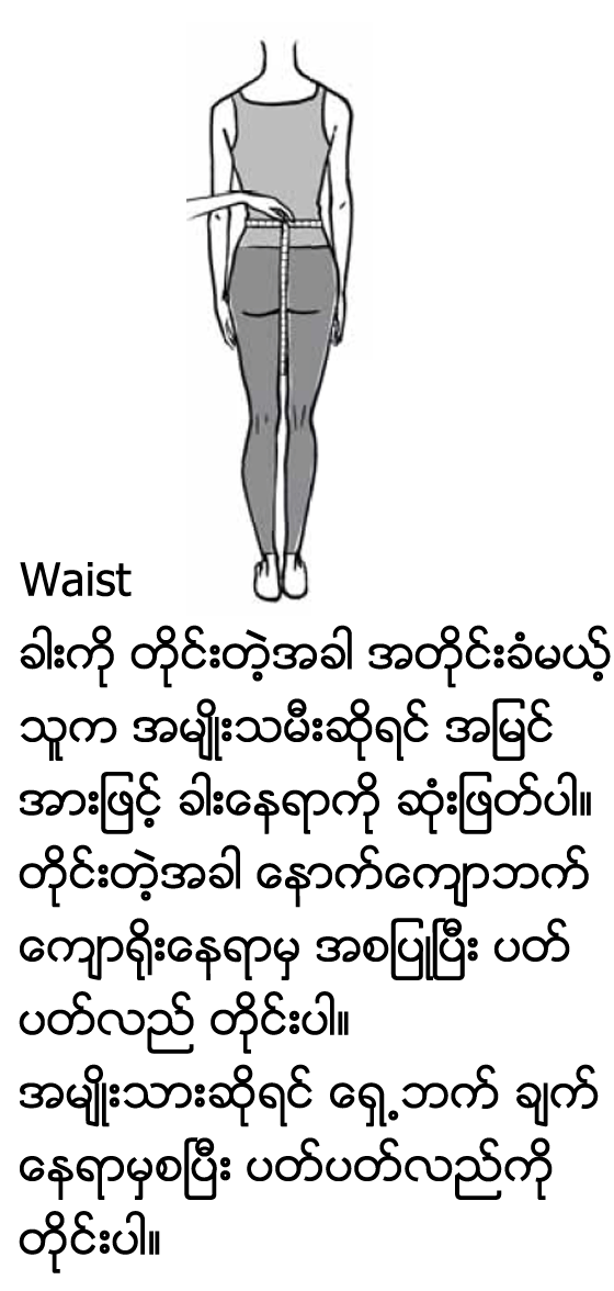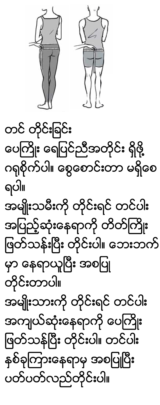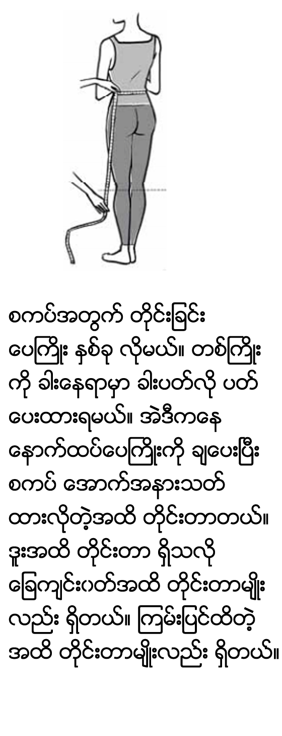 Fit အံကိုက်ဖြစ်အောင် ချုပ်လုပ်ပေးနိုင်ဖို့ ပေကြိုးနဲ့ တိုင်းတဲ့အခါ အတိုင်းခံမယ့်သူမှာ အတွင်းခံတွေ ဝတ်ဆင်ထားရင် ခပ်ပါးပါးဟာမျိုး ဝတ်ဖို့ ပြောထားရမယ်။ ဘာအတွင်းခံမှ မဝတ်ဘဲ တိုင်းနိုင်ရင်တော့ အကောင်းဆုံးပေါ့။ အပေါ်မှာ ဝတ်ထားတာတွေကလည်း ကိုယ်ခန္ဓာအချိုးအစားနဲ့ အကိုက်ဖြစ်တာမျိုးဆိုရင် အတိုင်းထက် အလွန် အကောင်းဆုံးပေါ့။