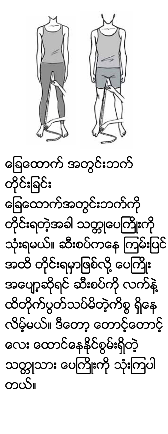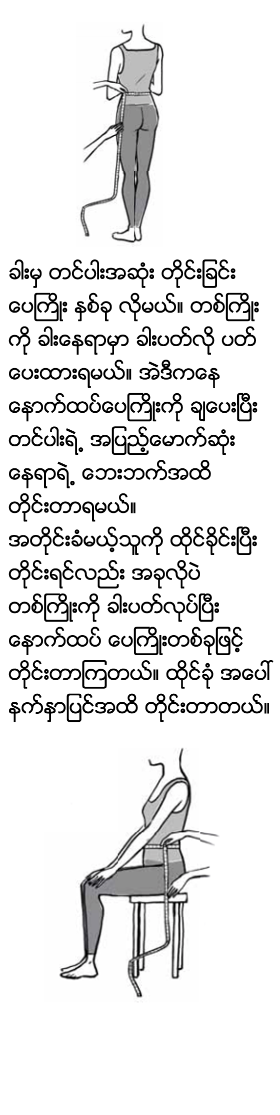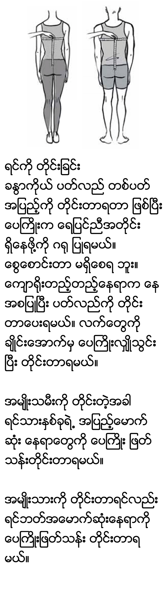 ေနာက္တစ္ခ်က္ သတိျပဳမိဖုိ႔က အတုိင္းခံရတဲ့သူဟာ သာမန္အခ်ိန္ေတြမွာ ေနေလ့ေနထရွိတ့ဲ ကုိယ္ေနဟန္ထားျဖင့္ ရွိေနဖုိ႔ ျဖစ္ပါတယ္။ ဒီေတာ့ ေပတုိင္းရင္ ကုိယ္လုံေပၚ မွန္ေရွ႕မွာ မရပ္ခုိင္းပါနဲ႔။ လူ႔သဘာ၀က ကုိယ္လုံးေပၚမွန္ထဲ ကုိယ့္ကုိယ္ကုိယ္ ျမင္ရတဲ့အခါ ၾကည့္ေကာင္းေအာင္ ကုိယ္ေနဟန္ထားကုိ အလုိလုိ ျပင္ၿပီးသား ျဖစ္သြားတယ္။ ခါးမတ္လုိက္မယ္။ လက္ျပင္ကုန္းေနတာ မကုန္းေအာင္ အေနအထား ျပင္လုိက္မယ္။ ဗုိက္ပူေနတာ မွန္ထဲက ပုံရိပ္မွာ သတိမူမိရင္ ဗုိက္ကုိ ရွပ္လုိက္မယ္။ ဒီေတာ့ ေပႀကိဳးနဲ႔ တုိင္းမယ္ဆုိရင္ ကုိယ္လုံးေပၚ မွန္ေရွ႕မွာ မရပ္ခုိင္းလုိက္ပါနဲ႔။ ေရာက္တတ္ရာရာ စကားေျပာဆုိေပးရင္း တုိင္းတာပါ။ သူ႕စိတ္က တုိင္းတာထဲဆီမွာ အာ႐ုံေရာက္လြန္းရင္လည္း ကုိယ္ေနဟန္ထားေတြ ျပင္လုိက္မိတတ္တယ္။ သူ႔ဘာသာသူ သတိမူမိမွာေတာ့ မဟုတ္ဘူး။ အလုိလုိ ျပင္ၿပီးသား ျဖစ္သြားမယ္။