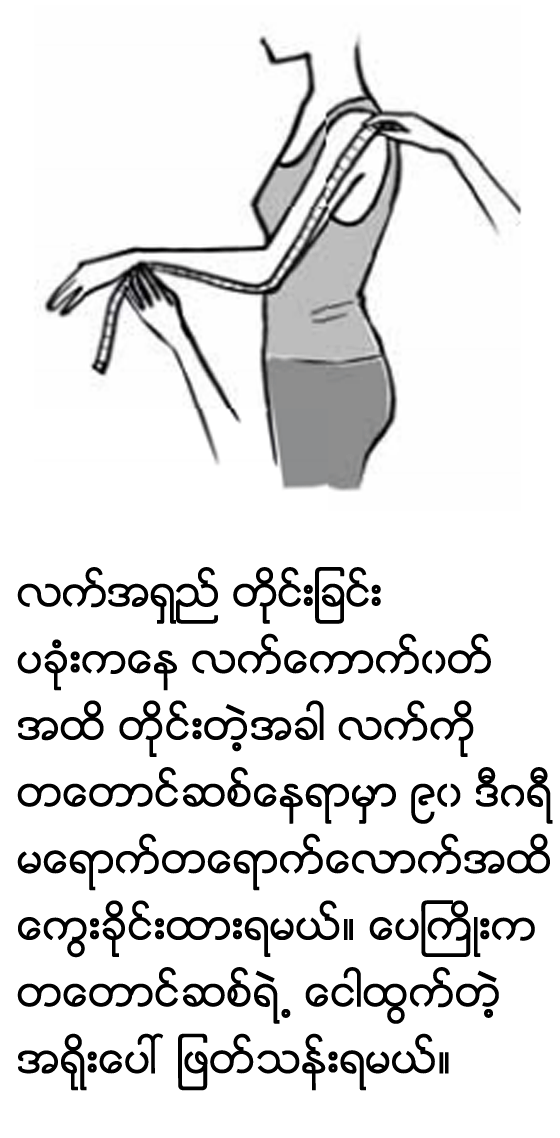 Fit အံကုိက္ျဖစ္ေအာင္ ခ်ဳပ္လုပ္ေပးႏုိင္ဖုိ႔ ေပႀကိဳးနဲ႔ တုိင္းတဲ့အခါ အတုိင္းခံမယ့္သူမွာ အတြင္းခံေတြ ၀တ္ဆင္ထားရင္ ခပ္ပါးပါးဟာမ်ဳိး ၀တ္ဖုိ႔ ေျပာထားရမယ္။ ဘာအတြင္းခံမွ မ၀တ္ဘဲ တုိင္းႏုိင္ရင္ေတာ့ အေကာင္းဆုံးေပါ့။ အေပၚမွာ ၀တ္ထားတာေတြကလည္း ကုိယ္ခႏၶာအခ်ဳိးအစားနဲ႔ အကုိက္ျဖစ္တာမ်ဳိးဆုိရင္ အတုိင္းထက္ အလြန္ အေကာင္းဆုံးေပါ့။